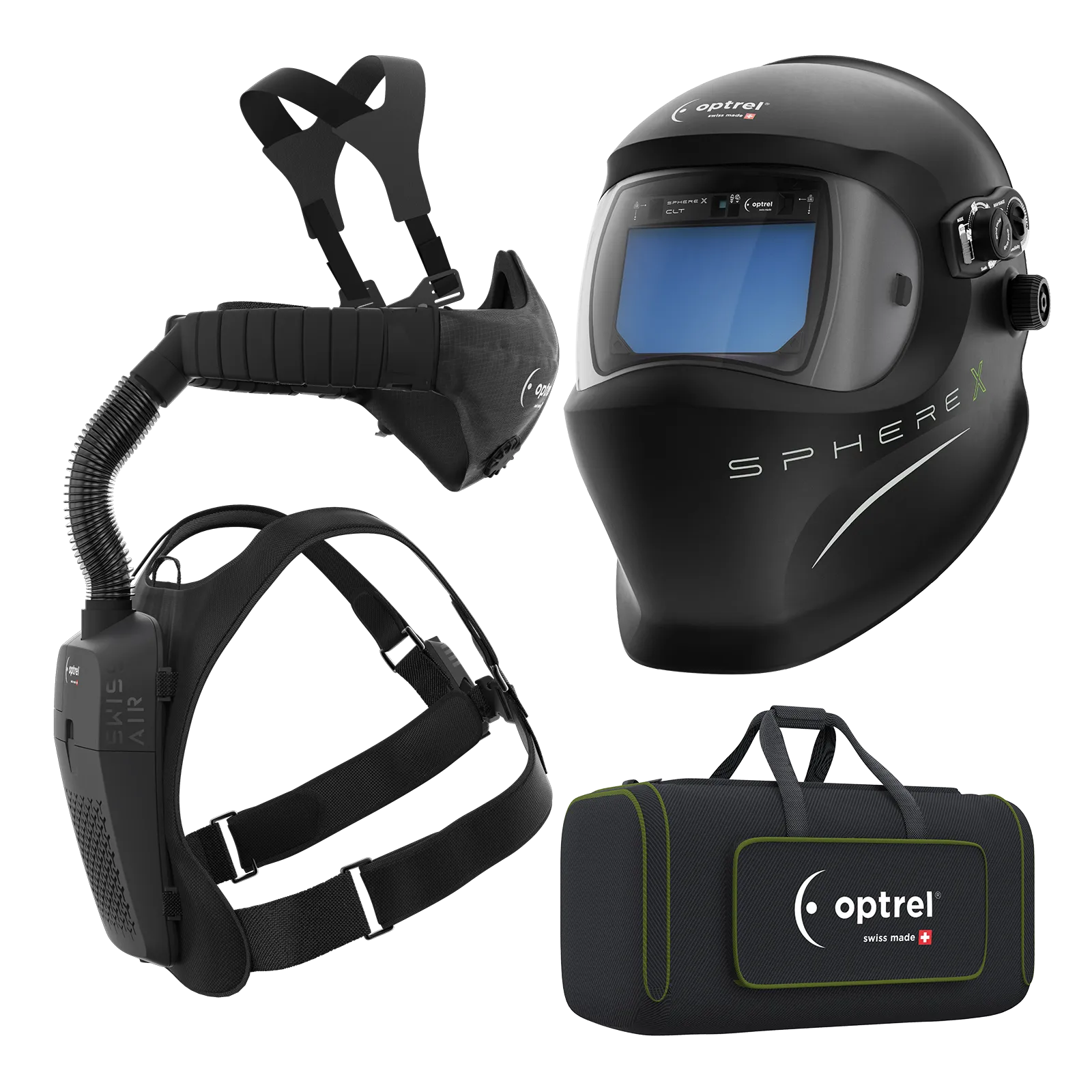 Ready to weld package sphere X clt schwarz - Schweisshelm und swiss air mit control panel, inkl. Komfort-Halbmaske: bestehend aus Halbmaske und Schlauchsystem inkl. Kopf- und Nackenband, Gebläseeinheit, Schultertrageeinheit, Ladegerät, Aufbewahrungstasche