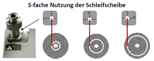 Effizientes Schleifen: Gewährleistet durch Schleifen in Längsrichtung der Elektrode, einen stufenlosen Schleifwinkel und drei Schleifpositionen auf der Diamantscheibe.